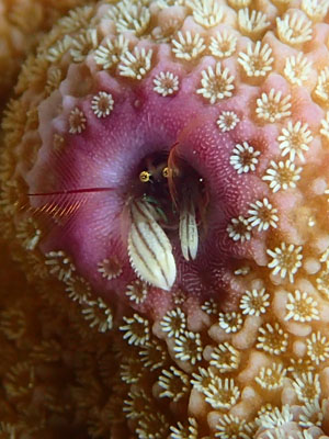 コエダナガレハナサンゴに居たオランウータンクラブことミナミクモガニ♪ | ||||